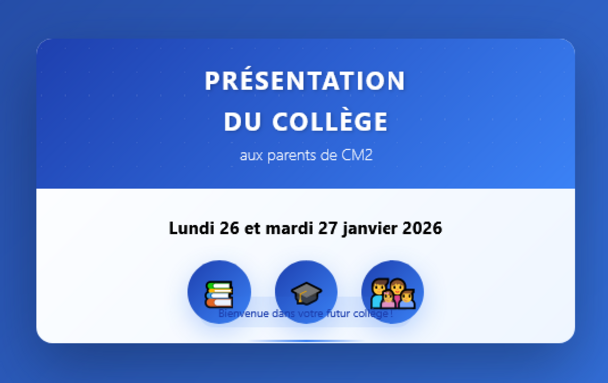 Par admin Georges-Rouquier, publié le vendredi 23 janvier 2026 16:38 - Mis à jour le vendredi 23 janvier 2026 16:40Mme Pierron, cheffe d'établissement, accueille les parents des élèves de CM2 pour leur présenter le collège au réfectoire à partir de 17h30 les lundi 26 et mardi 27 janvier. -